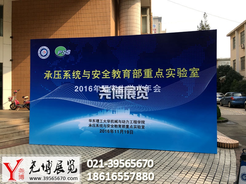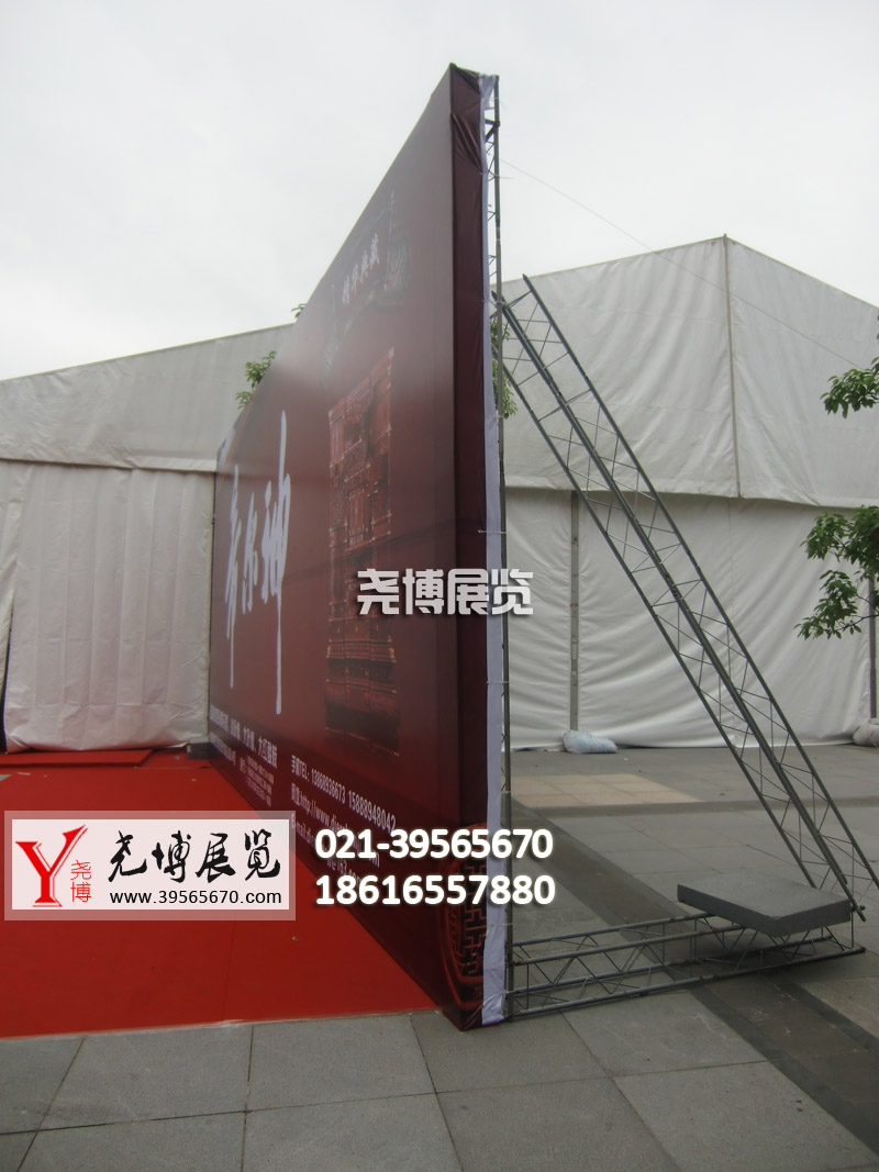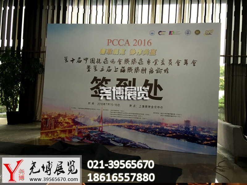 上海堯博展覽器材有限公司承接各種會議酒店背景板搭建、酒店會議背景板搭建、桁架簽到板背景制作。