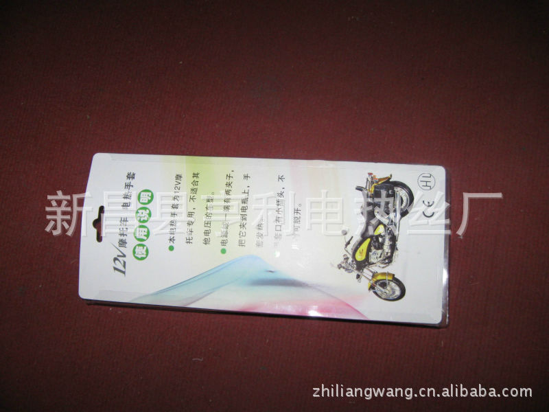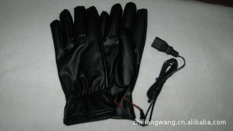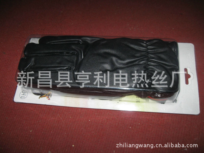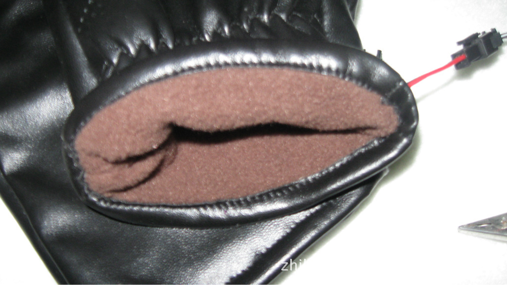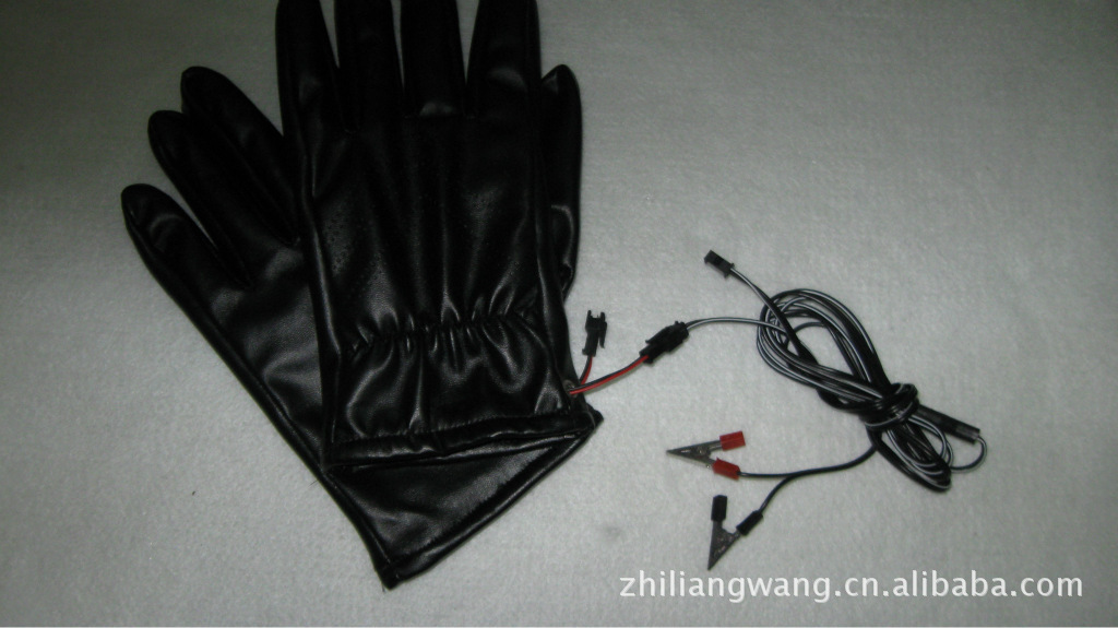 手套面料系優(yōu)質(zhì)人造革.里子為柔軟的絨布。手套五指和手背部布有耐溫200度的硅膠電熱絲,在零度環(huán)境下使用溫度達30度左右,使用前將摩托車電源線上電瓶夾子夾在電瓶上,然后將電源線用膠帶固定在車上,兩分線置于手把,手套口有小插頭,可脫開,使用時只要插上小插頭即發(fā)熱,不用要脫開,電動車也一樣將電源線固定后,使用時只要把品字形插頭往充電口插即發(fā)熱,