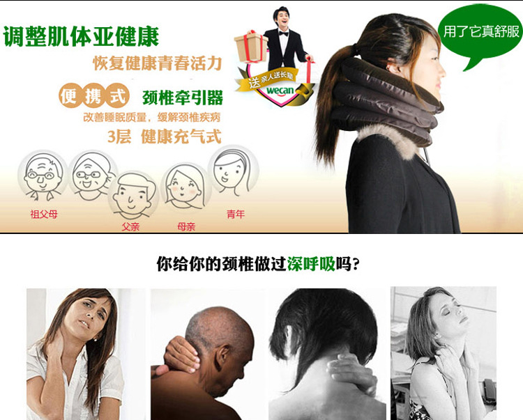 1、治療時(shí)盡量使頸部放松,慢慢充氣加壓,以增強(qiáng)牽引效果。