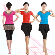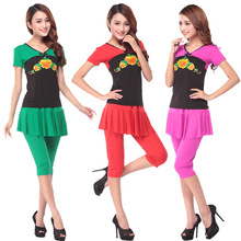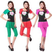 夏季新款廣場(chǎng)舞蹈裝短袖牡丹印花女士七分裙褲套裝演出跳舞服批發(fā)52.00