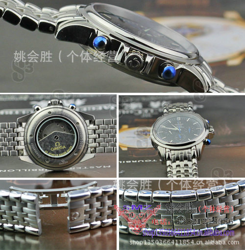 材質(zhì):高硬度耐磨藍(lán)寶石鏡面,炫銀表殼,全精鋼表帶,黑色表盤.炫銀條釘