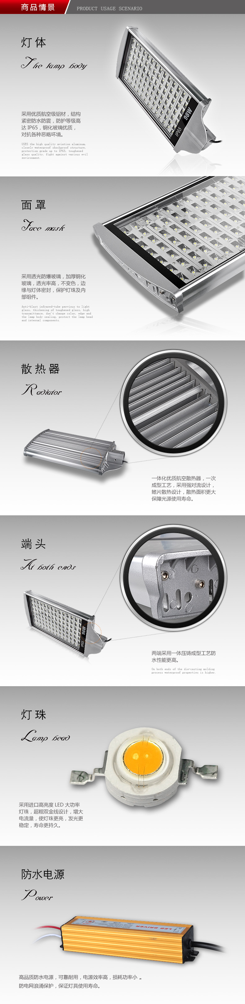 使用鋁壓鑄外殼散熱鰭片和散熱腔的雙重散熱技術(shù),有效降低大功率LED的溫度,另外驅(qū)動(dòng)電源部分與燈具分開(kāi)安裝,降低了燈體的額外溫升,并使維護(hù)方便。