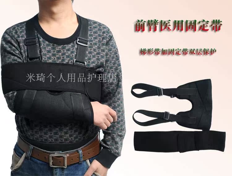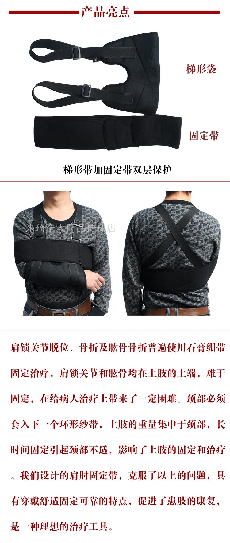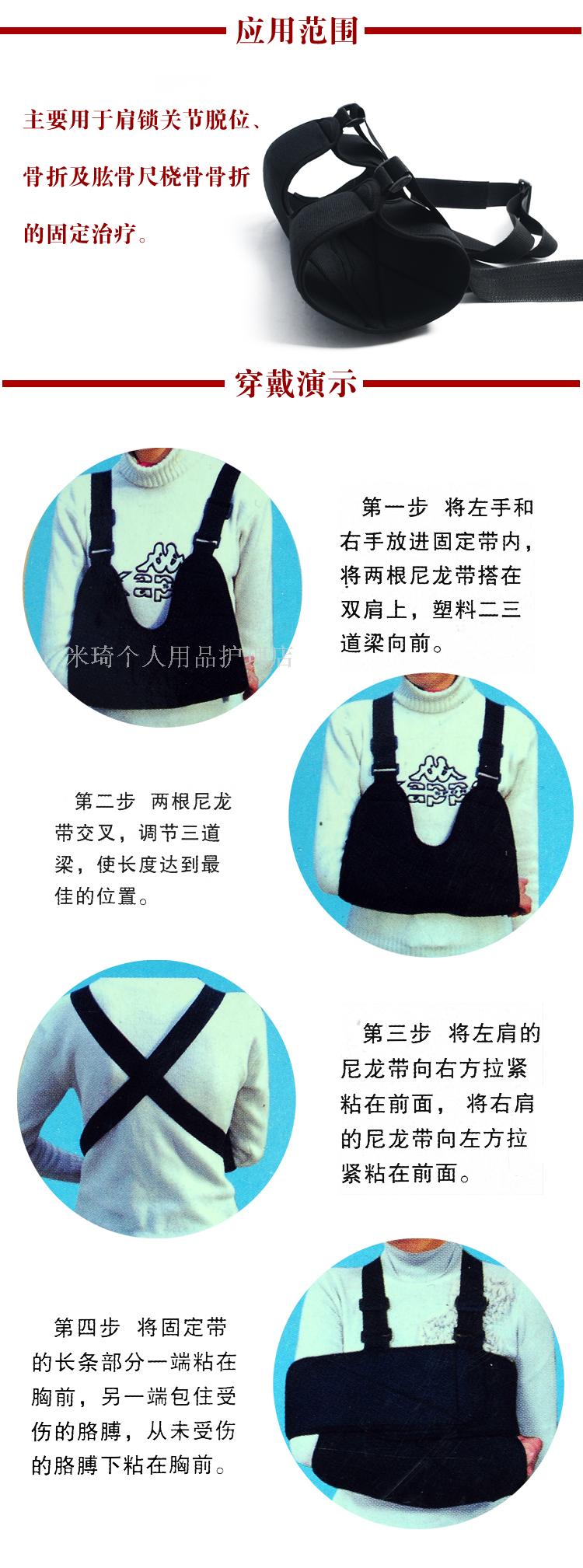本品由梯形袋和固定帶兩件組成,使用說明如下: 1、將患肢前臂穿入梯形袋,梯形袋上側兩端的背包帶格子通過同側肩膀在背部交差后,分別穿過腋下、梯形袋底部,與梯形袋前面的尼龍袋面布粘連。這樣固定使上肢的重量集中在雙肩上,且梯形袋上背包帶的伸縮可調節肘關節角度,使上肢固定在一個舒適的位置。 2、固定帶內外二層,外層由尼龍粘帶與布構成。內層由全棉絨布制成。內層兩端縫有尼龍粘帶,先將固定帶一端內層粘帶粘在梯形袋錢,然后把固定帶沿患肢、胸背部從雙側腋下繞一圈,重疊在固定帶上,將另一側內層粘帶粘在固定帶外層尼龍袋布上,使患肢牢固固定。 3、肩肘固定帶必須在醫師指導下使用。 4、使用本品時,若患肢出現腫脹,疼痛加重、麻木,應立即去醫院咨詢。 5、使用本品時,未遵醫囑,不可隨意除去。 6、本品不可熱水洗滌,不可曝曬。 7、本品必須存放在干燥通風處。