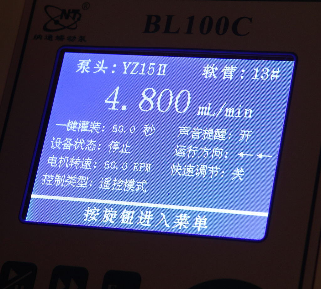 主界面通用特點(diǎn)1、具有一鍵灌裝功能,可以定時(shí)定量的進(jìn)行單次灌裝。2、具有自動(dòng)流量校準(zhǔn)功能,使得流量控制更,適合定量傳輸液體。3、可安裝多種泵頭:如YZ15Ⅱ、YZ25Ⅱ、MC4X、MC8X系列泵頭。4、無(wú)極調(diào)速,操作簡(jiǎn)便直觀。5、采用“雙CPU”控制,驅(qū)控分離,運(yùn)算速度快,工作穩(wěn)定,傳輸精度高。6、設(shè)有全速按鈕:具有快速填充、排空功能。7、采用步進(jìn)電機(jī)控制轉(zhuǎn)速,不受負(fù)載變化的影響。8、大轉(zhuǎn)矩、低功耗,適應(yīng)性強(qiáng)。9、驅(qū)動(dòng)電路性能優(yōu)良,散熱性好,工作噪音小,運(yùn)行平穩(wěn),具有掉電記憶功能。BL300C蠕動(dòng)泵驅(qū)動(dòng)器技術(shù)參數(shù):