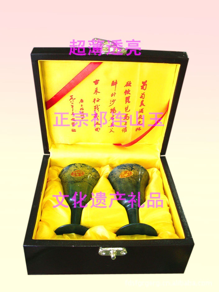 “敦煌夜光杯”造型獨特,式樣精巧,其色黑賽烏漆,白如羊脂,墨綠似翠,紋飾天然,杯薄如紙,光亮似鏡,內外平滑,玉色透明。夜光杯不但含有多種對人體有益的礦物質,而且抗高溫,耐嚴寒。敦煌出產的夜光杯色澤有翠綠、鵝黃、羊脂白等,光澤長久不變,造型豐富多彩,聲譽隆。帶有天然紋理,石色墨綠,薄如蛋殼、手感細膩,真有“一觸欲滴”的美妙效果。夜光杯質地光潔,色澤斑斕,宛如翡翠,倒入美酒,酒色晶瑩澄碧。尤其皓月映射,清澈的玉液透過薄如蛋殼的杯壁熠熠發光。唐人王翰詩云“葡萄美酒夜光杯”,詩以杯出名,杯因詩增輝。敦煌出產的夜光杯色澤有翠綠、鵝黃、羊脂白等,光澤長久不變,造型豐富多彩,聲譽隆。