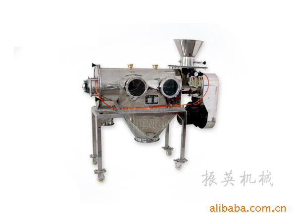 本設備篩網為圓筒狀,置于機體內,物料通過螺旋輸送系統后,和氣流混合、霧化進入網筒內;通過網筒內風輪葉片使物料同時受離心力和旋風推進力,從而近使物料噴射過網,由細料排出口排出,不能過網的物料沿網筒壁從粗料排出口排出。