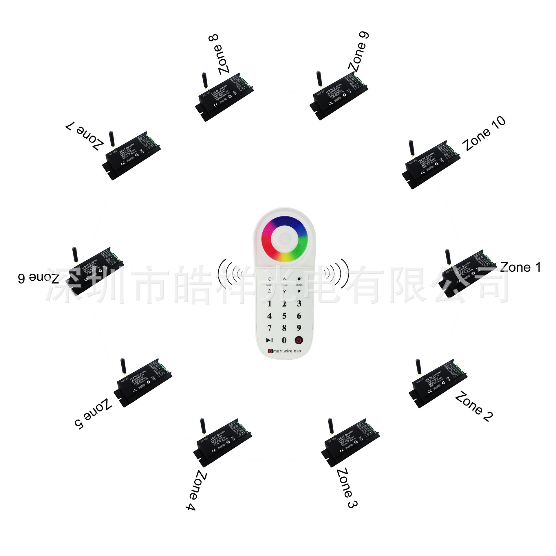采用RF無線射頻觸摸18鍵遙控進行控制,實現多達10個區域的獨立控制,包括開關、暫停、模式調節、/速度調節和亮度調節。接收器部分可以與本公司的RGB信號放大器進行功率擴展,實現對更多LED燈的控制,理論上可以連接無數個RGB放大器。