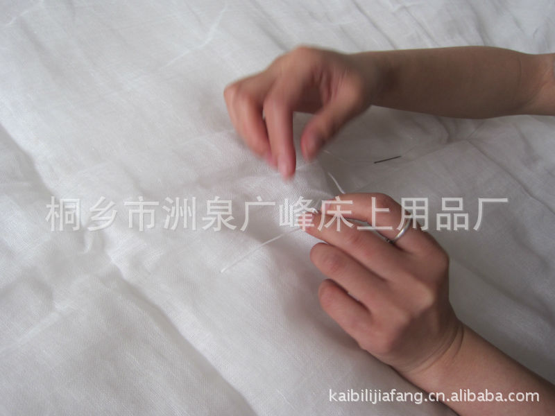 一般蠶絲被的使用說明都是說蠶絲被芯不可水洗、不可干洗、不可氯漂、不可熨燙,那總不能眼巴巴地讓它一直臟下去吧?所以,首先建議送干洗店專業處理,如果你想自己動手豐衣足食,那你可以用中性洗滌液(如洗蔬果用的洗滌靈)局部擦拭低溫烘干,蠶絲纖維耐酸不耐堿,應避免使用堿性太強的洗衣粉和肥皂洗滌,以防纖維受到損傷。肥皂還會與水中的鈣、鎂離子結合形成皂垢沉積在絲纖維上,使絲綢泛黃、粗硬。洗滌以手洗為佳,一般不宜機洗,更不可刷洗。洗滌溫度在30℃以下為宜,先用手將水中的洗滌劑攪勻后方可放入被芯,在水中浸泡時間不要超過五分鐘,用手輕柔搓洗、漂清,洗后不可絞擰以防絲縷位移、綢面發紕。由于蠶絲蛋白質分子在日光下會發生光化學反應引起泛黃和脆損,因此只能陰干,不宜曝曬。絲綢易起皺,洗后熨燙很有必要,后請您注意:熨燙時,不宜高溫、不宜直接熨燙,必須在上面加蓋一層濕布,適宜的溫度還能使晾干后粗硬的手感變得柔軟如初,但溫度超過130℃后會導致泛黃。熨燙時切忌噴水,以防產生水跡痕影響美觀。