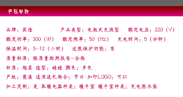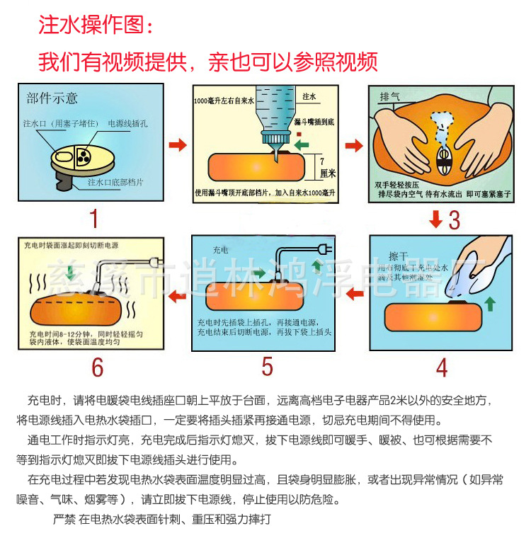 4)通電:劃開電源蓋.將電源線插頭插入電源線插孔上.在接通電源.正常通電8-15分鐘.但以手感舒適度為佳.備注:1.先將電源線插孔插入水袋的插孔上再接通電源.2.充電結束后應先拔去外接電源.再分離電源線插頭與水袋.