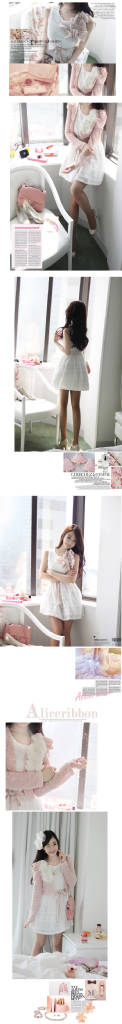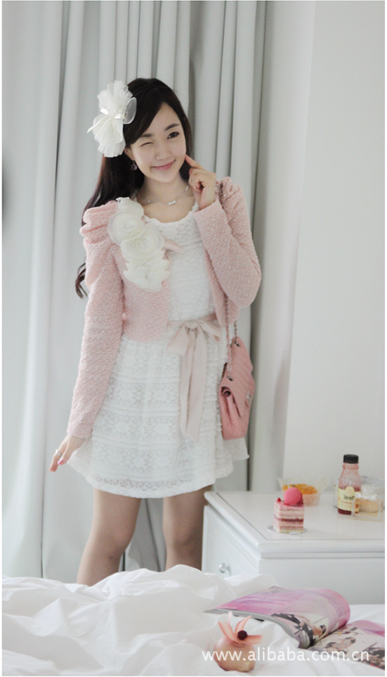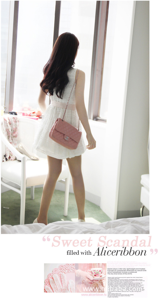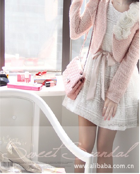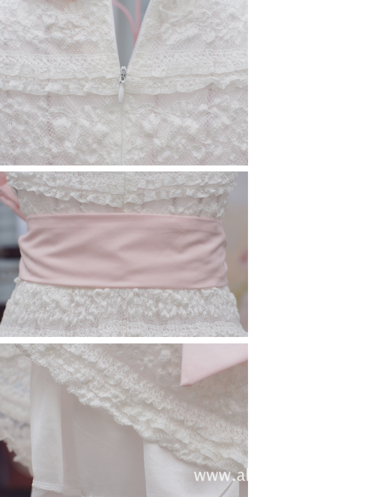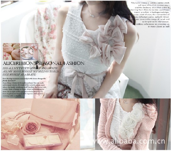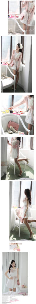 大大的蝴蝶結(jié)。嫩嫩的水粉.腰間還配上這么一條雪紡的腰帶。雪紡‘蕾絲‘兩者搭配。甜美的小女生。性感的小女人。都很適合呢。親們.穿上它.讓這個夏天更美好吧!