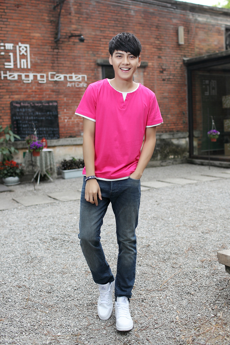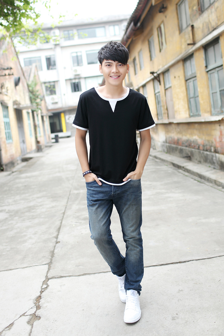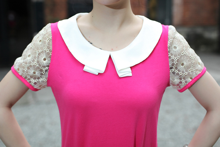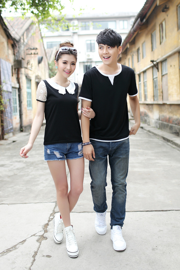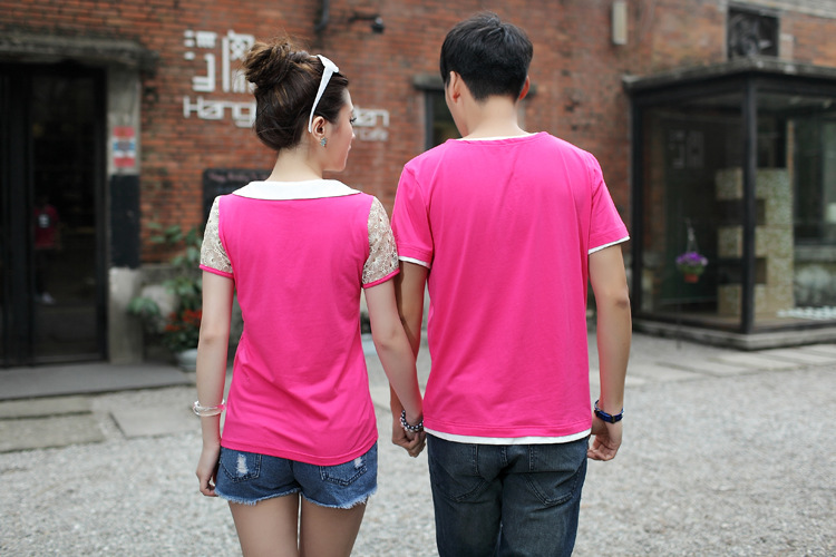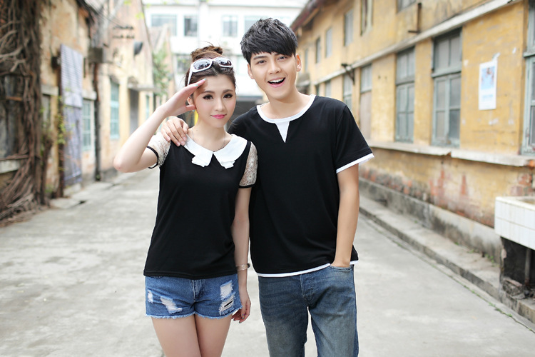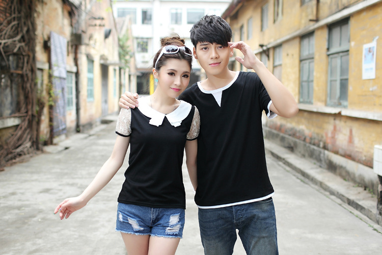 9221#(實拍)情侶裝夏裝 2015新款韓版娃娃領蕾絲夏季短袖T恤女