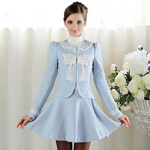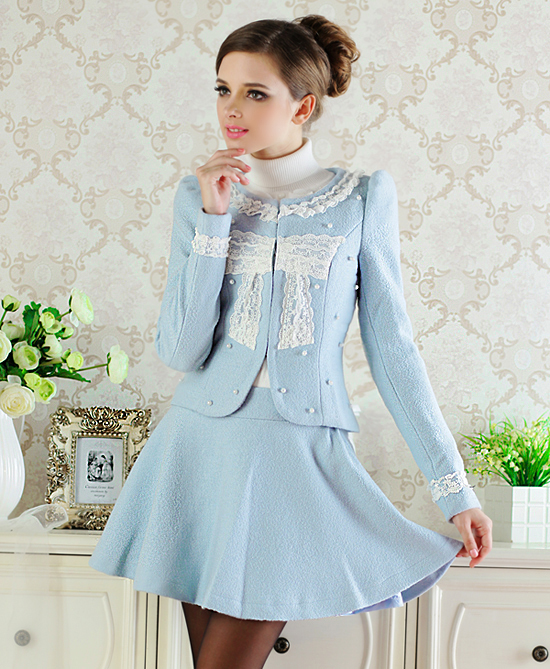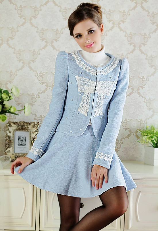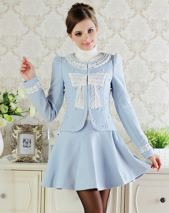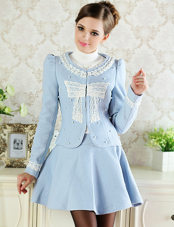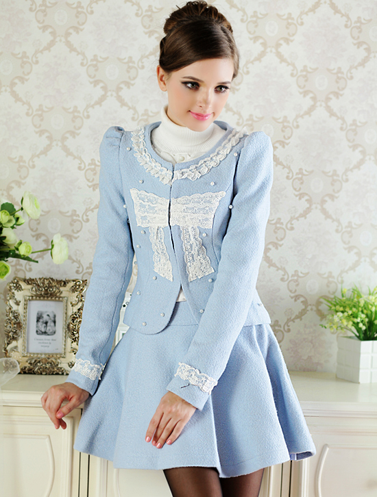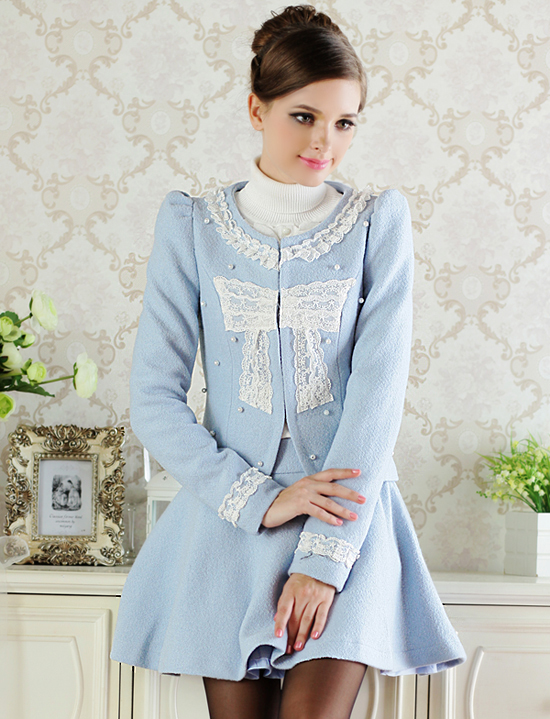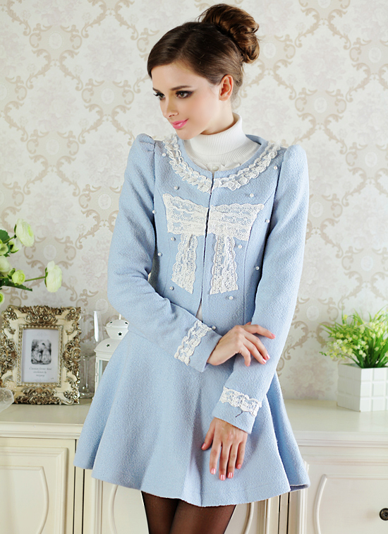 面料: 80.4%聚酯纖維19.6%羊毛 花邊::60%聚酯纖維40%棉 歐根紗:100%聚酯纖維里料:93.9%聚酯纖維6.1%氨綸