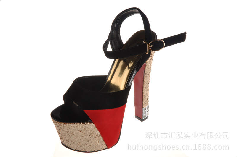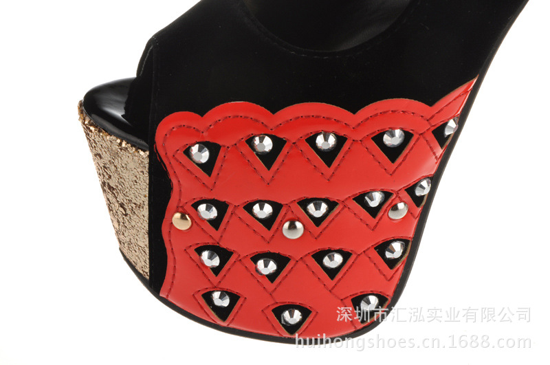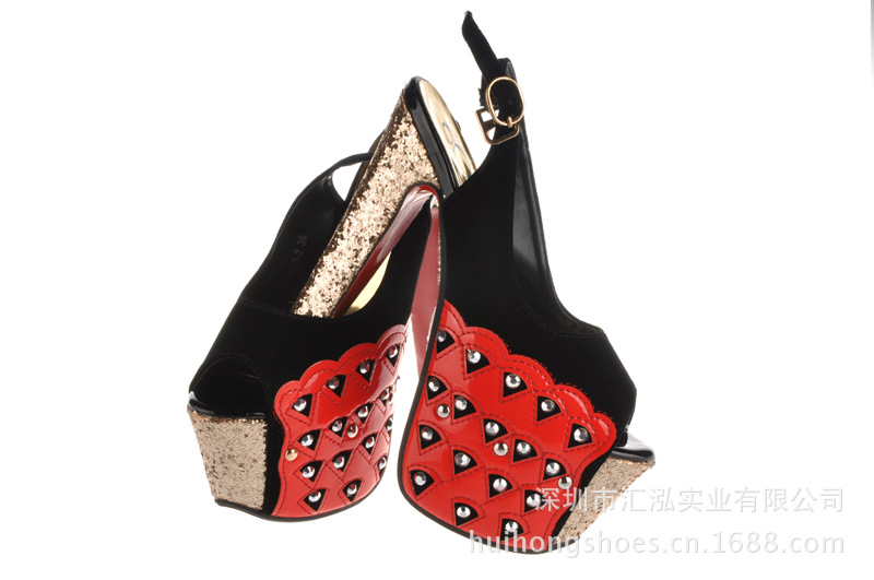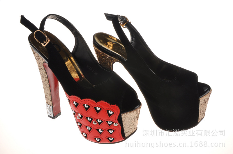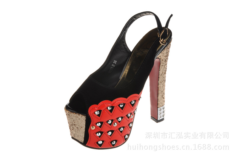 這款鞋子的設計還是很時尚的,賣點是金閃閃的效果、鉚釘、魚嘴設計還有紅色PU大底。紅低高跟鞋是由世界著名的女鞋設計師Christian Louboutin在時尚界帶起的一股潮流。