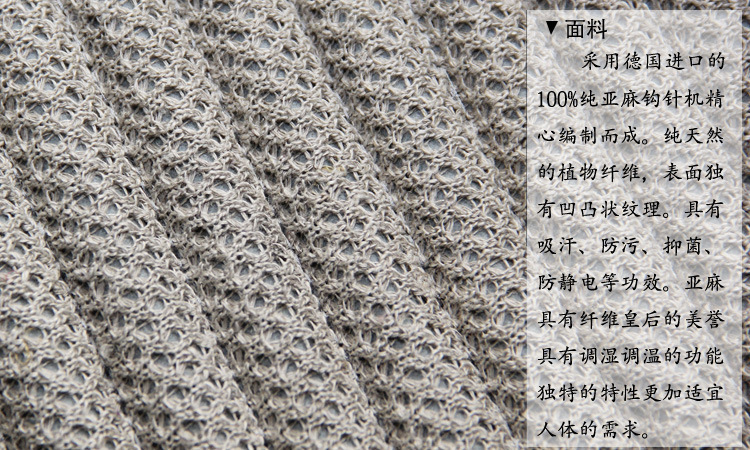 采用德國進(jìn)口純亞麻鉤針機(jī)編制 凹凸?fàn)罴y理 吸汗 防污 抑菌 防靜電 有效調(diào)濕調(diào)溫 亞麻屬于純天然植物纖維 特性更適宜人體的需求 內(nèi)填充蕎麥殼 明目 活血 久坐可緩解疲勞 亞麻具有纖維皇后的美譽(yù) 周邊與皮革相結(jié)合 凸顯氣質(zhì)買家必看: