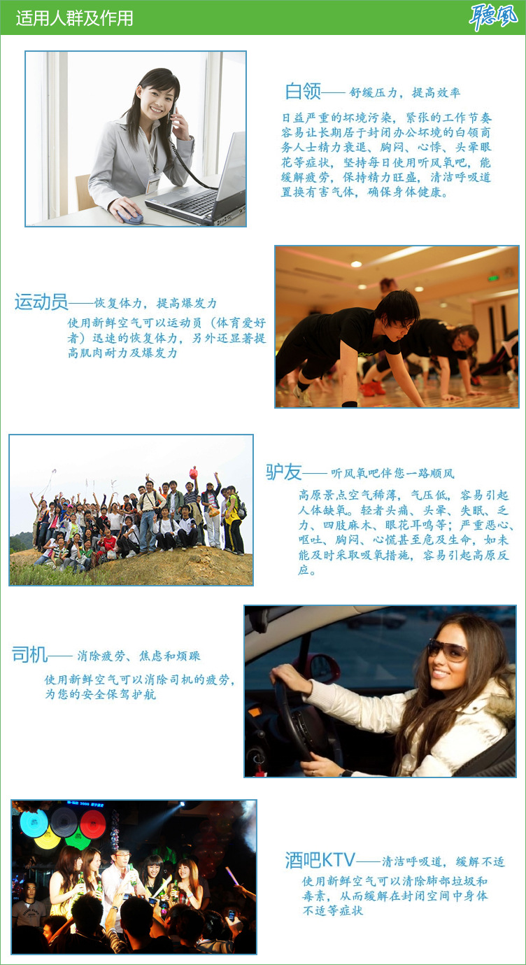 6、休閑旅游:在卡拉OK、迪斯高舞廳、網(wǎng)吧、酒吧、桑拿中心等各種娛樂(lè)休閑場(chǎng)所使用,隨時(shí)隨地享受新鮮空氣;亦可用于煙酒過(guò)度后清醒神志,具解酒之功效,也可在旅游過(guò)程中補(bǔ)充體內(nèi)氧氣含量,解除疲勞狀態(tài),清醒頭腦。