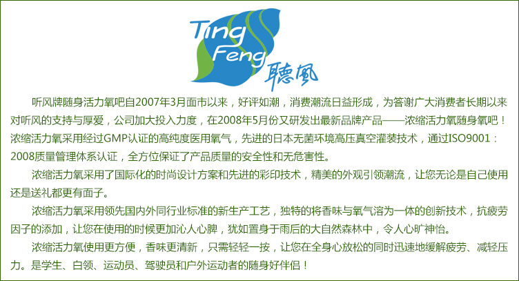 聽(tīng)風(fēng)牌氧氣罐,也叫“隨身氧吧”、“便攜式吸氧器”、“小型罐裝氧氣”,分為多種水果香型。具有含氧量高、體積小、攜帶方便、使用方便的特點(diǎn)是一種新型的綠色保[jian]用品,適用于:體育運(yùn)動(dòng)、腦力透支、工作高壓、休閑旅游等領(lǐng)域,具有迅速緩解疲勞、提神醒腦、提高工作學(xué)習(xí)效率等功效!是學(xué)生、白領(lǐng)、運(yùn)動(dòng)員、駕駛員和戶外運(yùn)動(dòng)者的隨身好伴侶!