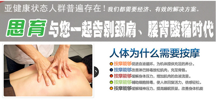 思育創始至今,始終傳承著簡約、時尚、舒適、自然的品牌風格和精湛的設計藝術,引領著按[mo]器具的時尚潮流。思育一直堅持以人為本的設計理念,將按[mo]器械的工業設計與中國古老的推拿理論完美結合,每一款產品都根據人體工程學原理進行開發。設計出能貼近消費者的按[mo]產品,體現了科技帶來的優雅與靈動。我們綜合現代人追求自然、舒適、健康的浪漫情懷,滿足了人們對陽光心情的追逐和健康長壽的訴求,為生活增添了無限動力。公司要求嚴謹,采用高起點、守信用、重質量、積極開拓創新、追求卓越的路線,用真誠來感動每一位客戶,以質量及服務贏得每一位客戶的信賴,業務在不斷地擴大發展。企業優質產品的實現,靠的是精益求精、踏踏實實的工作作風,任何不務實的查驗,不嚴謹的態度都會導致產品質量的下滑,從而失去市場。公司產品行銷于中國本土、法國、西班牙、荷蘭、日本、中東、東南亞等多個國家地區。 思育用熱情的雙手隨時歡迎四海賓客,希望能同國內外新老客戶精誠合作,共謀發展大業。