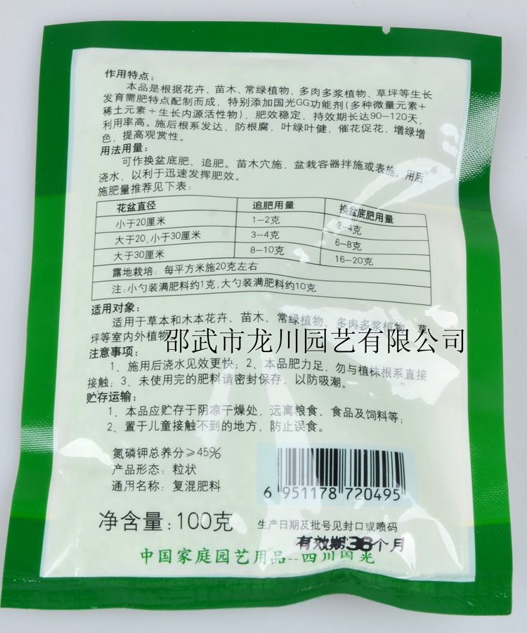 本品是根據花卉、苗木、常綠植物、多肉多漿植物、草坪等生長發育需肥特點配制而成,特別添加國光GG功能劑(多種微量元素、稀土元素、生長內源活性物),肥效穩定,持效期長達90-120天,利用率高。施肥后根系發達,防根腐、葉綠葉健,催花促花,增綠增色,提高觀賞性。