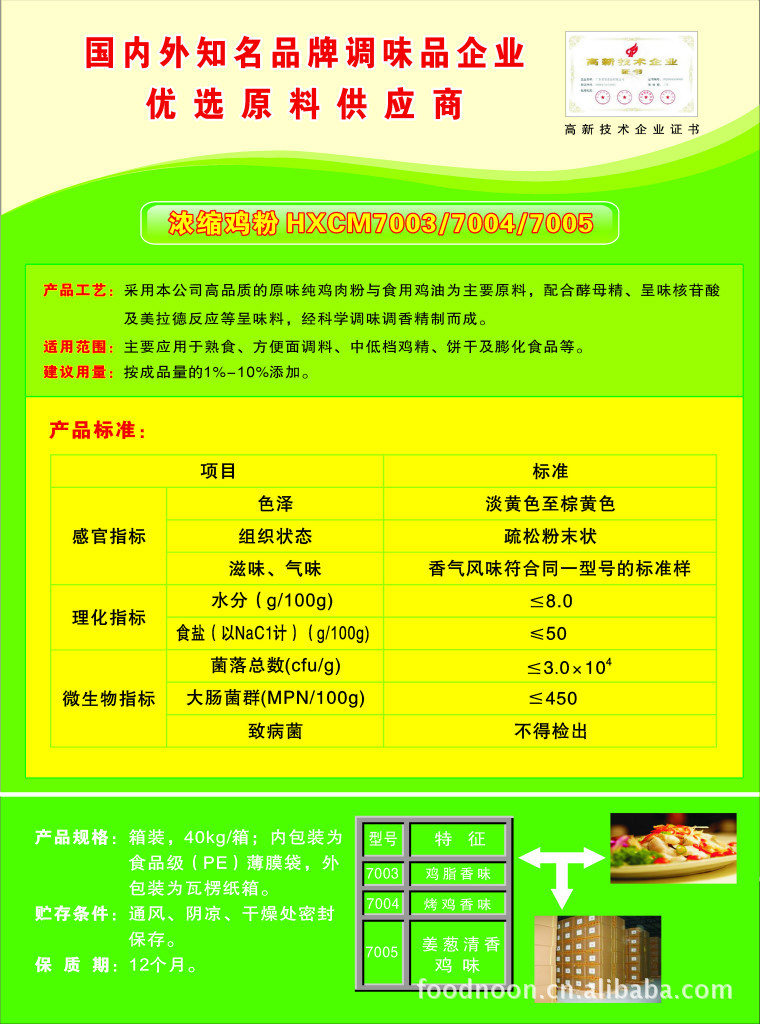 產品特點:采用山地放養雞經科學熬煮、水相抽提、真空濃縮、噴霧干燥精制而成,保留雞的原汁原味香原色,肉香型,純正濃郁的煮雞風味,蛋白質≥40%。