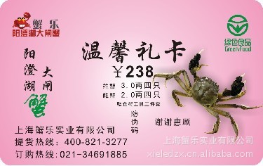陽澄湖大閘蟹禮卡8只裝9折促銷中,熱線:400-821-3277