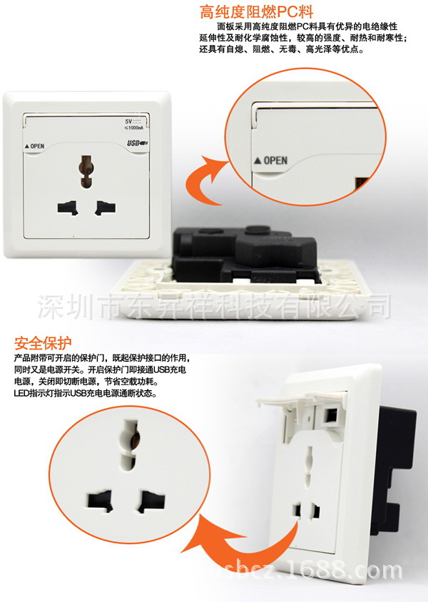 5,可開啟的USB保護門,既起保護USB接口的作用,同時又是USB電源開關。開啟保護門即接通USB充電電源,關閉即切斷USB電源,節省空載功耗。