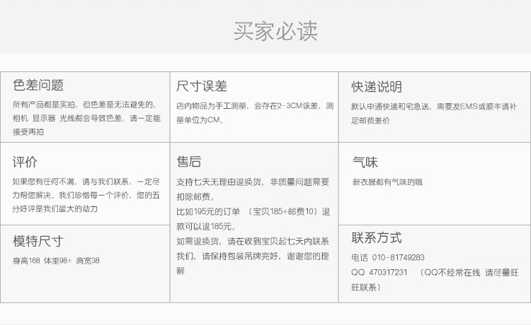 尺碼裙長腰圍制作工藝臀圍M80cm松緊腰 平鋪1尺9拉伸至3尺2片裙完美裁剪無縫拼接無限制L90cm松緊腰 平鋪1尺9拉伸至3尺2片裙完美裁剪無縫拼接無限制松緊腰 只區分裙長材質外裙材質:毛呢 內襯材質:聚酯實物拍攝實物拍攝,色差不可避免,光線亮一些;暗一些;拍出的裙子顏色以及明暗度都會有差別。一般室內看就會暗些,室外陽光下就亮一些洗滌方式推薦干洗。如水洗請避免使用甩干,會比較傷面料。毛呢面料如水洗會脫浮色是正?,F象快遞快遞默認申通和宅急送其他說明很多親希望客服幫忙參考尺碼,因每個人情況不同,我們只能根據之前買家的購買記錄為大家推薦。我們提供的意見僅供您參考,終選擇尺碼還以您的決定為準。