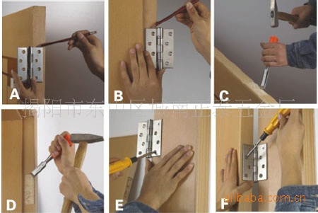 將門與門框對齊,每個合頁用兩個螺釘固定在門扇上,試開啟門扇,檢查間隙是否合理。調節合適后擰緊全部螺釘。每個合頁用8個螺釘固定。