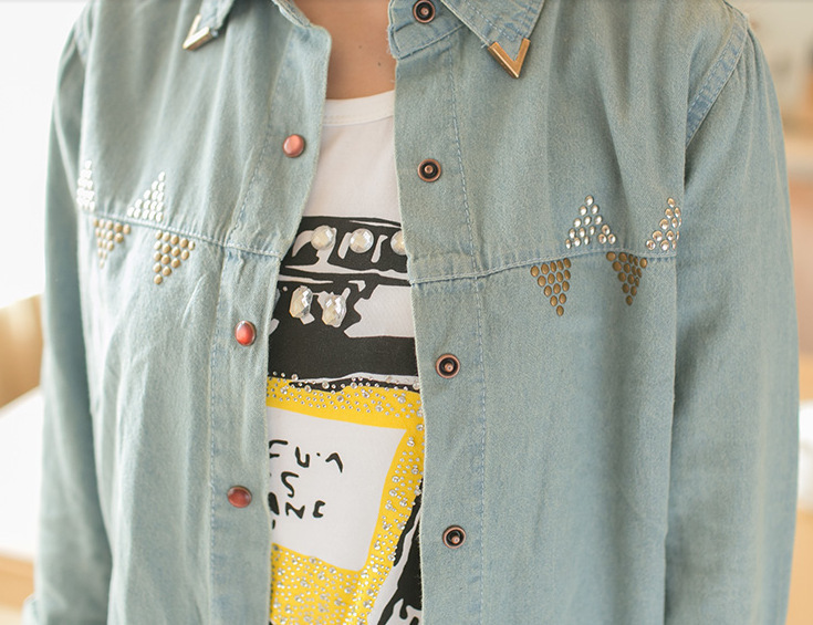 本季的牛仔襯衫勢(shì)必要將帥氣和中性進(jìn)行到底,這件襯衫的架勢(shì)你們一定會(huì)著迷,襯衫的質(zhì)地是適合春秋貼身穿著的全棉牛仔,經(jīng)過(guò)柔軟水洗整燙處理的牛仔布非常服帖,完全不用擔(dān)心內(nèi)搭外穿的版型問(wèn)題,這件潮版襯衫上還有另一大亮點(diǎn),鉚釘裝飾加以巧妙的布局設(shè)置,在胸前簡(jiǎn)約但強(qiáng)勢(shì)的凸顯出來(lái),更在領(lǐng)口安裝了鉚釘領(lǐng)角,加入裝飾后的襯衫完全突顯了它帥氣和中性的風(fēng)格,任誰(shuí)都無(wú)法取代它獨(dú)特的潮流特色。