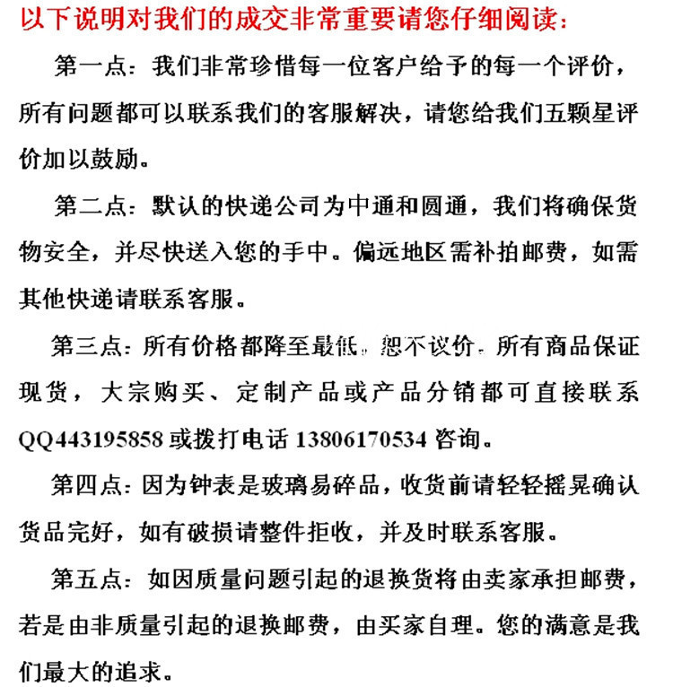 光臨選購(gòu)。為了您的購(gòu)物旅途愉快,請(qǐng)您看完以下信息:我店從事鐘表實(shí)體批發(fā)20余年,剛嘗試網(wǎng)絡(luò)銷售,不足之處還請(qǐng)您多多諒解。謝謝!!