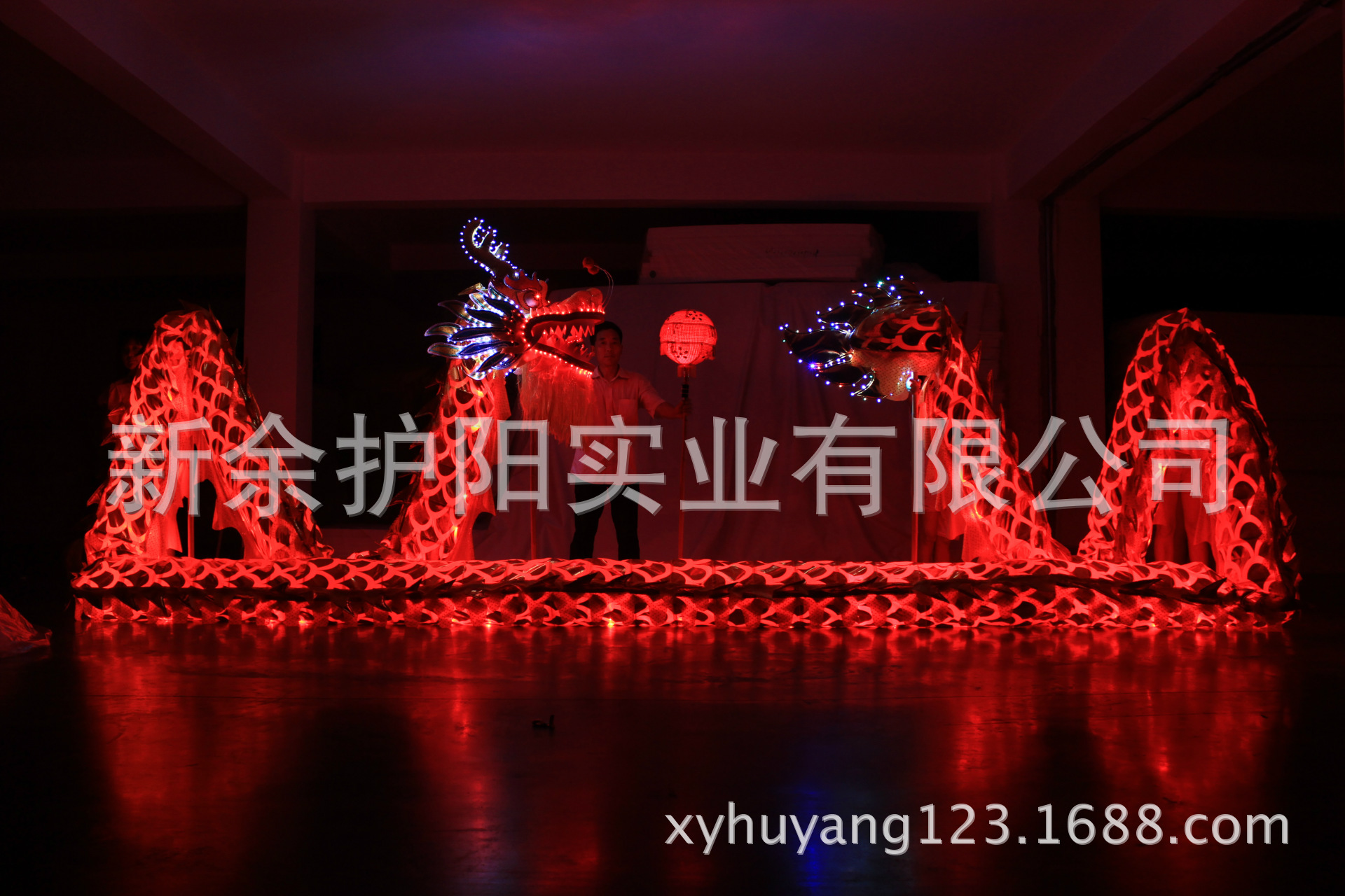 標準規格:9把一珠18米長(10舞的標準比賽用龍),龍身直徑33CM,龍頭-長0.9米-寬0.5米-高1.2米。包裝完成后總重13公斤,其中龍頭重2公斤,龍桿重4公斤。龍頭,龍身,龍尾,龍珠分拆成一個紙箱外加一把竹桿包裝,非常方便運輸。內配小工具和安裝彩頁示意圖,可在十分鐘內清晰明了地快速組裝。每一款龍都可以加裝成帶LED的燈光龍。