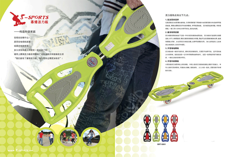 2 、靠身體扭動(dòng)而前進(jìn),不需用腳推滑,可做各種花式變化動(dòng)作,健美運(yùn)動(dòng)。