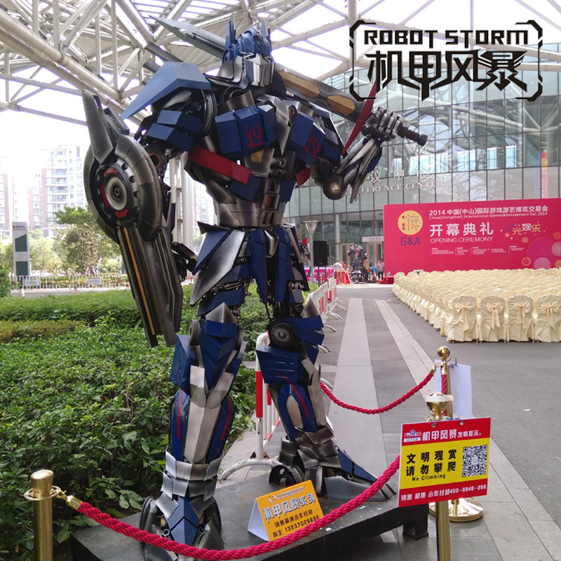 一代機甲戰士以家喻戶曉的變形金剛鋼雕為造型,采用環保回收鋼材等為材料,可實現身體七彩玄幻燈光效果,眼鏡會發光。