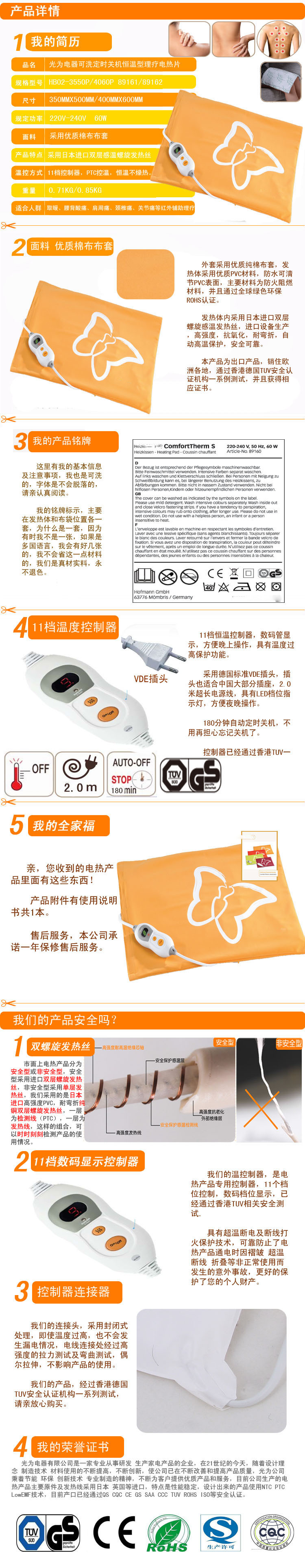 公司生產的主要產品有電熱毯,熱敷墊等。目前公司生產的電熱產品主要原件及發熱線采用日本及英國進口。特點是性能穩定,設計出來的產品使用NTC,PTC,LOWEMF技術,使產品在安全特性方面走在行業前端。目前產品已通過CE,GS,SAA,TUV 等安全認證。