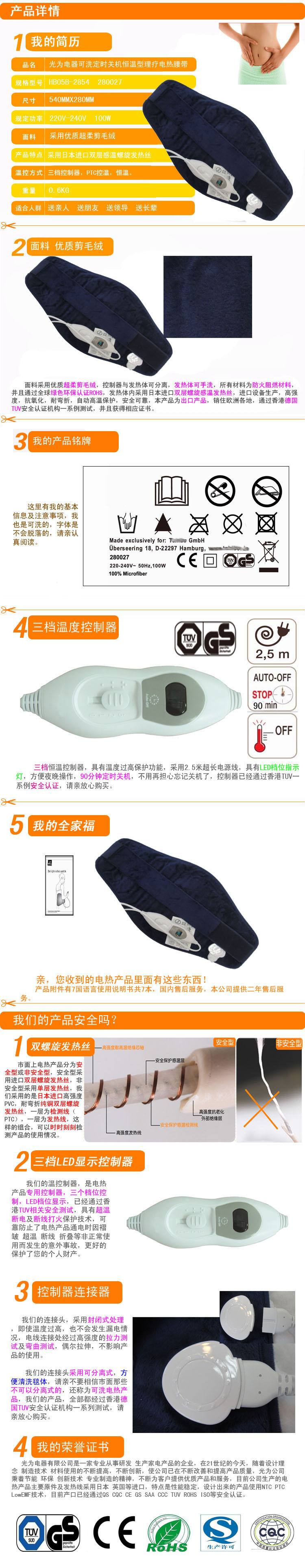 公司生產(chǎn)的主要產(chǎn)品有電熱毯,熱敷墊等。目前公司生產(chǎn)的電熱產(chǎn)品主要原件及發(fā)熱線采用日本及英國(guó)進(jìn)口。特點(diǎn)是性能穩(wěn)定,設(shè)計(jì)出來的產(chǎn)品使用NTC,PTC,LOWEMF技術(shù),使產(chǎn)品在安全特性方面走在行業(yè)前端。目前產(chǎn)品已通過CE,GS,SAA,TUV 等安全認(rèn)證。