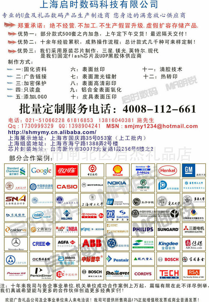 生產線及原材料皆由本人親自負責,本著誠信為本.合作互贏的原則,可以保證我司出品無一個U盤移動存儲是升級假貨!有一賠十,所有產品實行一年免費包換保修,實行三年售后服務!本地客戶更可驗貨后付款!外地客戶亦可支付寶交易!