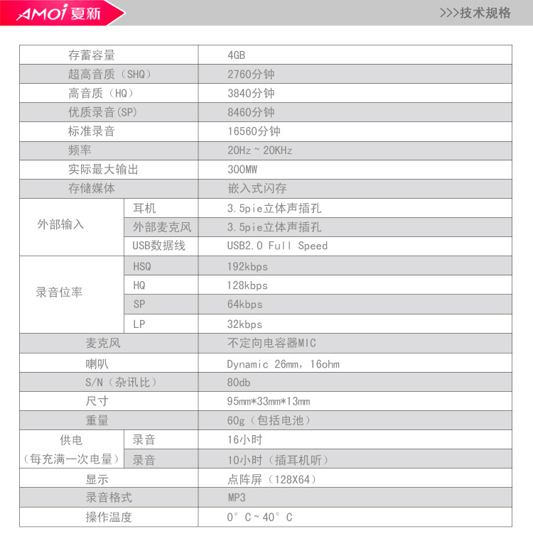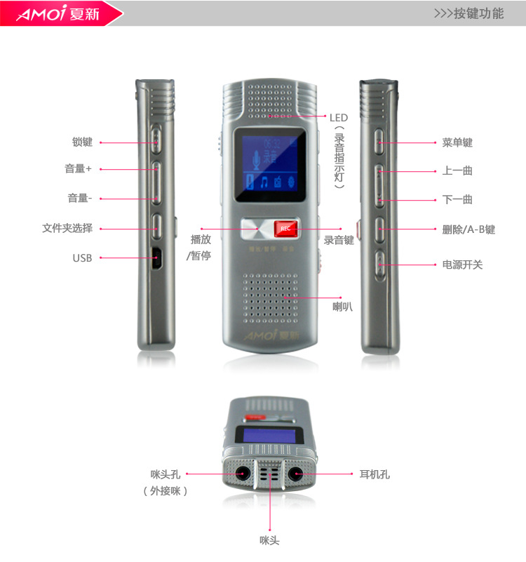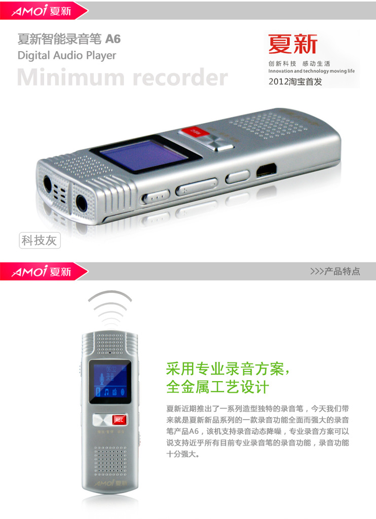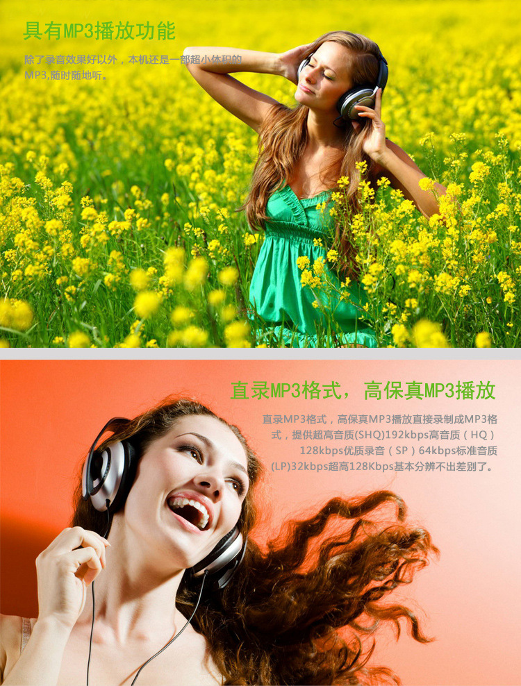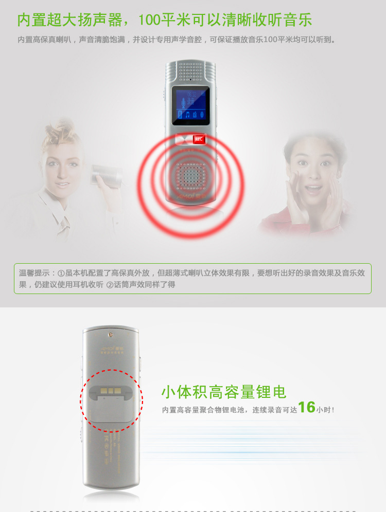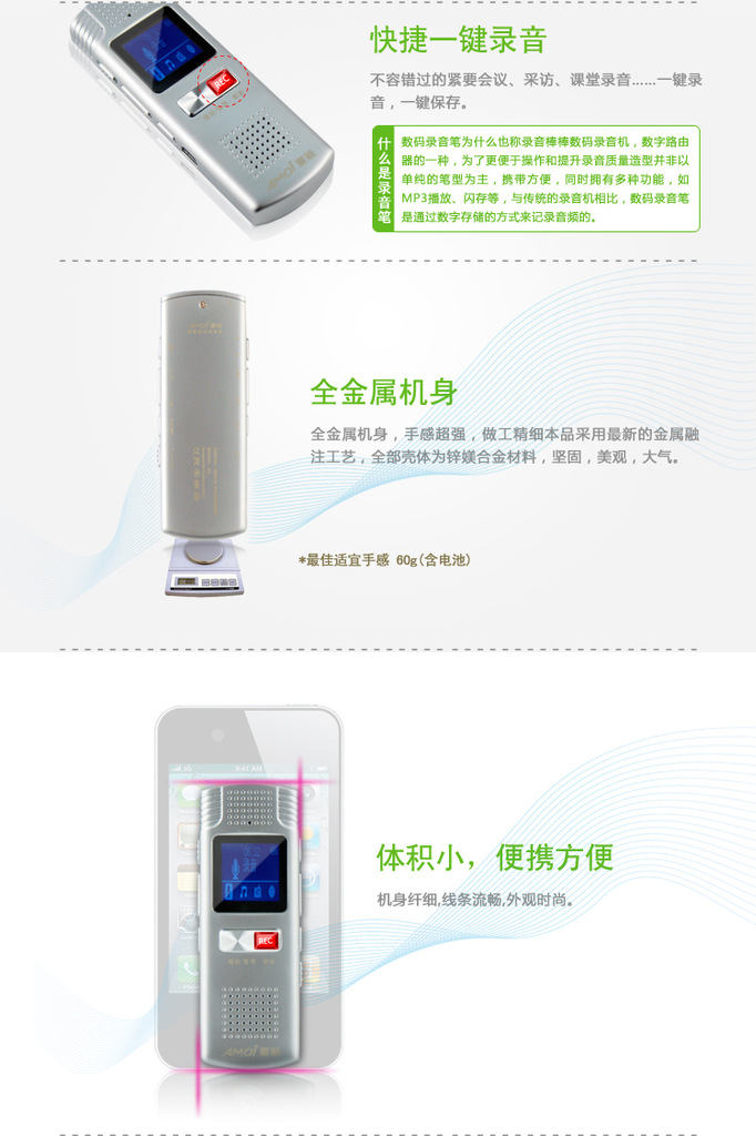 優勢1:鋅合金模具,質感非常好優勢2:外觀時尚大氣,可作為MP3使用優勢3:音質表現非常好,外放效果好,便于與他人分享優勢4:高品質PCM384kbps錄音,行業領先優勢5:機身自帶刪除功能,刪除錄音文件更加方便 優勢6:中文顯示屏,方便操作優勢7:表面高檔噴漆,耐磨優勢8:屏幕中文顯示,方便操作優勢9:采用高性能主控芯片,反應速度快
