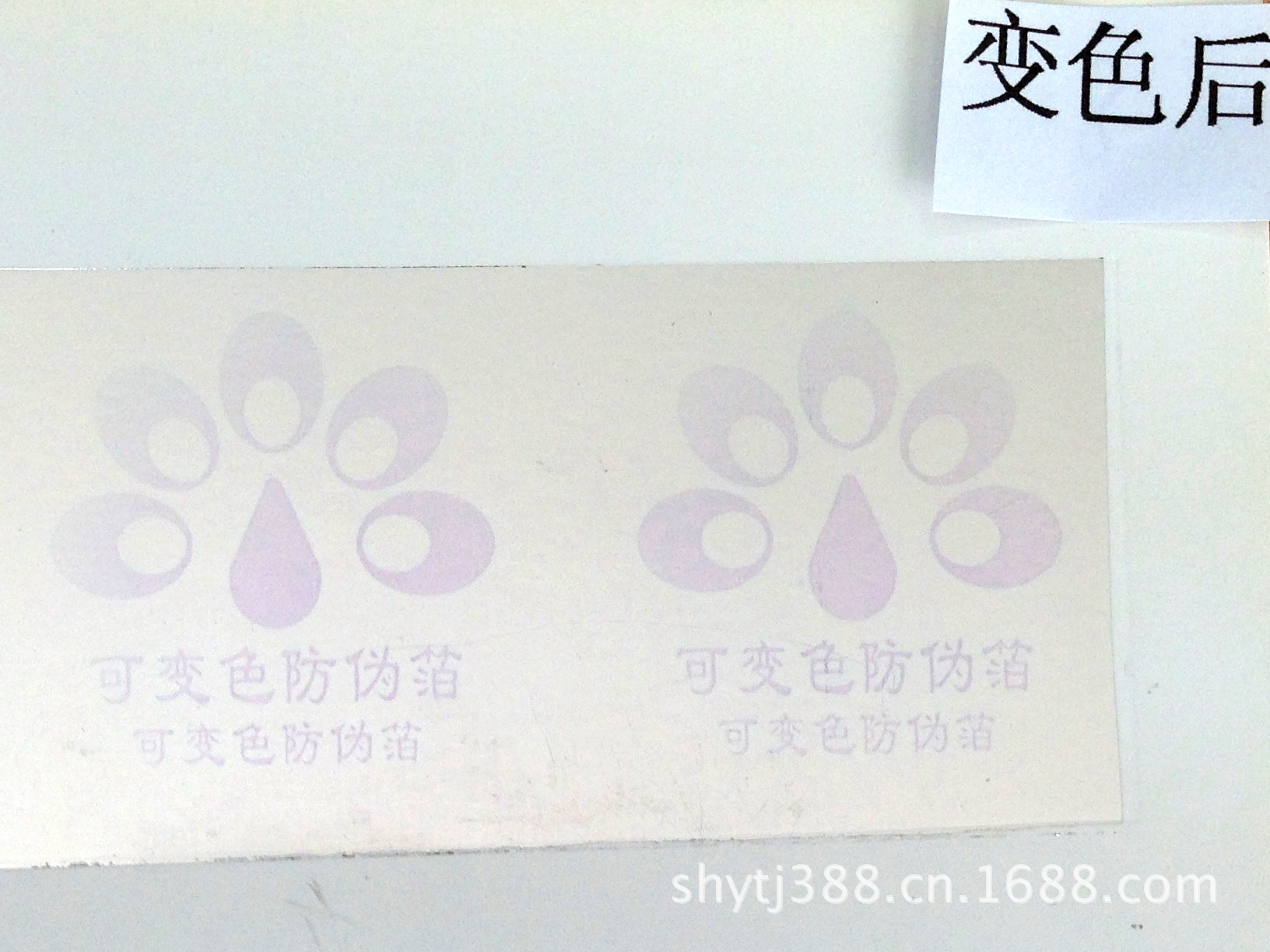 獨有功能:在太陽光或紫外光照射下能呈現出各種圖案、商標、文字。離開光源各種圖案、商標、文字消失仍恢復原來精美的電化鋁燙印效果。