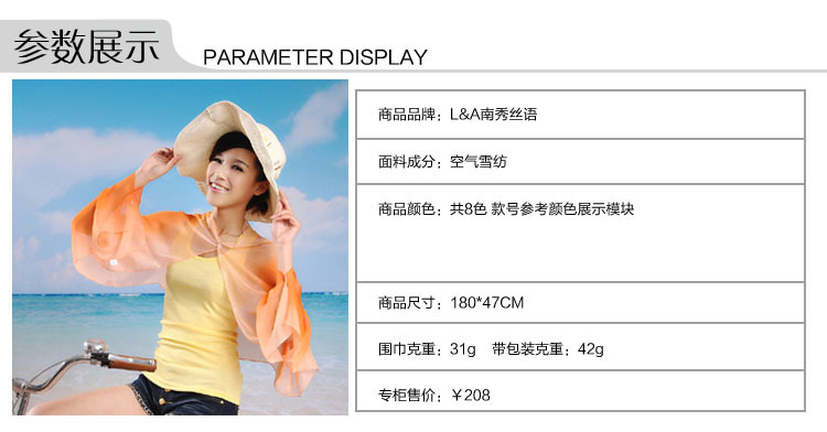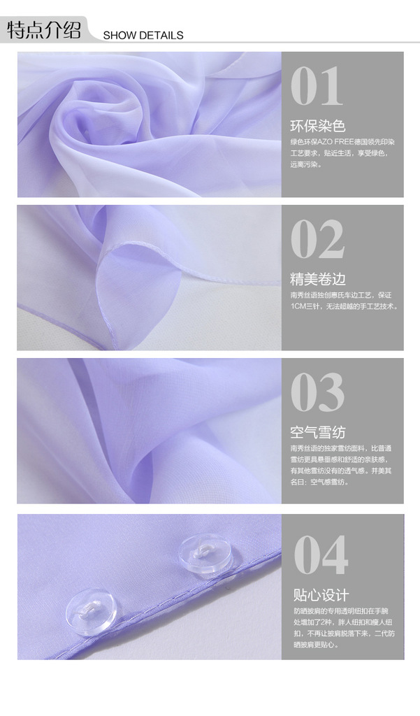 質(zhì)地輕薄透明,手感柔順富有彈性,有良好的透氣性和懸垂性,兼具飄逸感,披肩上7個紐扣