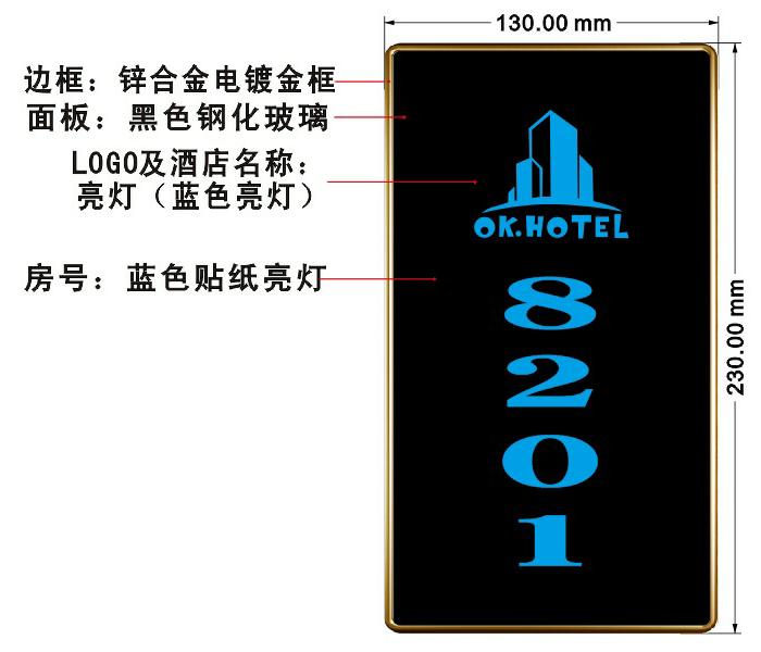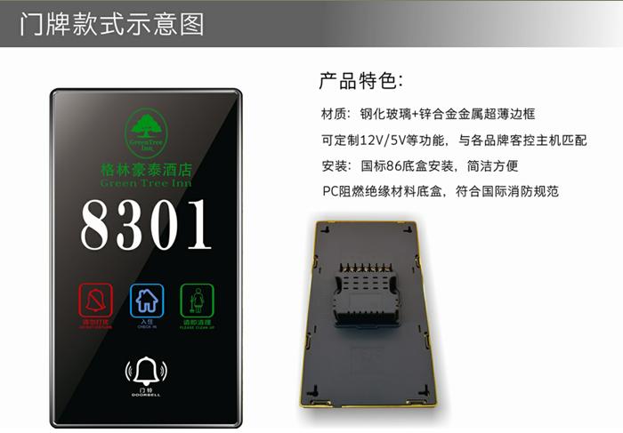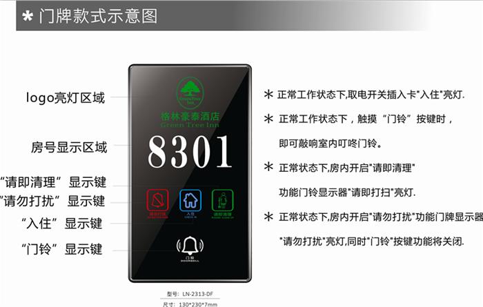 智能電子門牌是專為酒店客房精心設計,集房號顯示及服務房態(房間號、請勿打擾、請即清理、有人無人、觸摸門鈴按鈕)為一體的七合一酒店客房智能門牌。