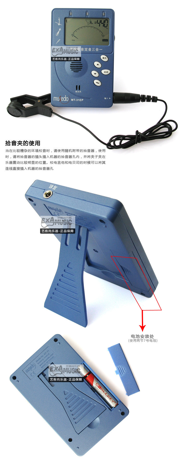 電源:3V(AAA電池2粒)A4示范音:435~445Hz校音器模式校音范圍:A0(27.5Hz)~a3(1760Hz)校音方式:手動校音或自動校音校音項目:十二平均律、二胡、琵琶定音器模式十二平均律示范音選擇范圍:2A~6A二胡空弦音示范琵琶空弦音示范節拍器模式節拍器速度調整范圍:30~230拍/分鐘時值選擇范圍:
