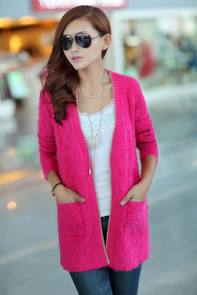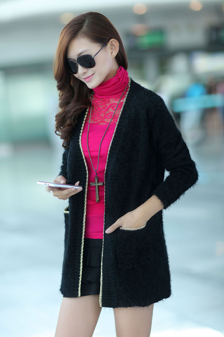 v領均碼韓版開衫寬松長袖中長款毛針織衫外套女裝2013秋季黑色
