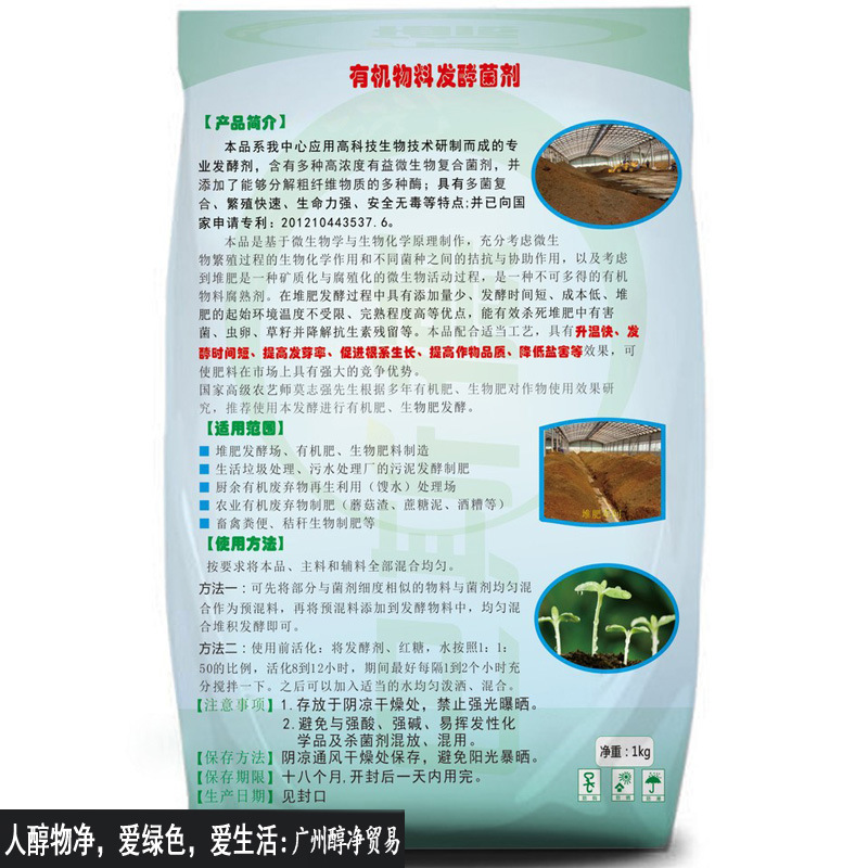 每千克腐熟劑(160元/Kg)可用于10-20噸有機物料發酵生產;
