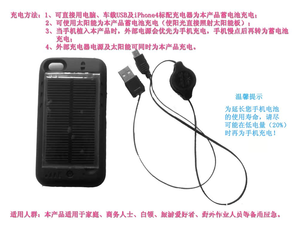 1、 可直接用電腦、車載USB及Iphone4標配充電器為本產(chǎn)品蓄電池充電;5~6小時即可充滿。
