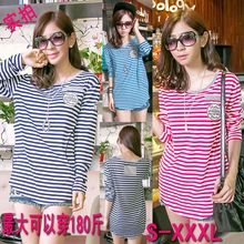 東大門女裝秋季寬松長袖t恤中長款條紋大碼女裝打底衫一件代發¥31.00
