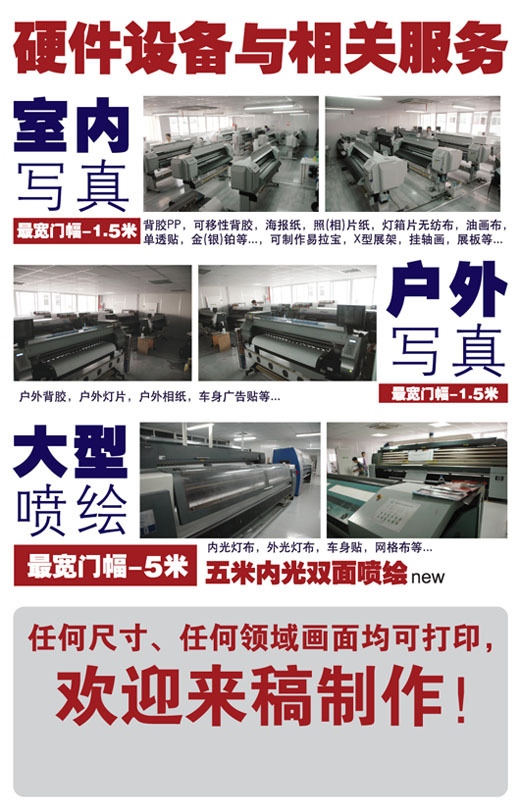 戶外寫真:PP背膠寫真、PP合成紙(不背膠)寫真,燈片寫真、相紙寫真、雙面寫真,隔光布雙面寫真,可轉移背膠寫真,專用膜寫真、透明片寫真、PVC膠片寫真、藝術布寫真、油畫布寫真、白畫布寫真、無仿布寫真,車貼寫真、燈布寫真、單孔透貼寫真