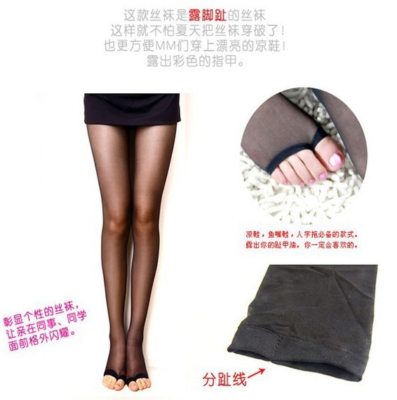 日常生活中,女性夏天穿裙子著涼鞋時(shí),涂趾甲油穿絲襪就掩蓋了腳部的美,或者穿著涼鞋配傳統(tǒng)絲襪又顯得老土,而不穿絲襪又有失端莊、優(yōu)雅及禮貌。 此款露趾襪既解決了以上的不便和著人字涼鞋不能穿絲襪的苦惱,又美觀、時(shí)尚,透氣性好,穿著干爽舒適。