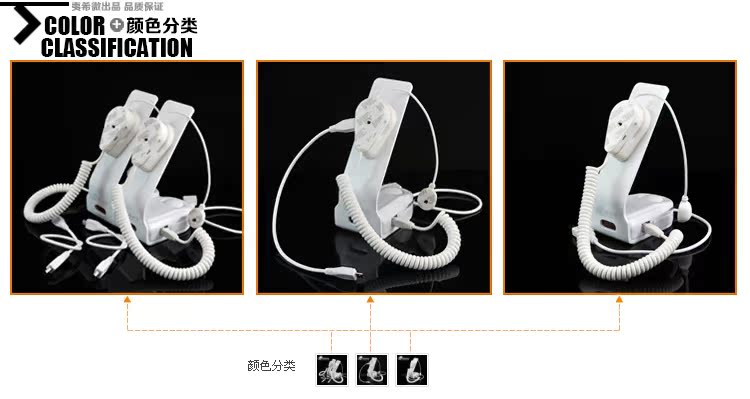 本品的默認的充電線是MicroUSB充電線,iphone系列不適合本防盜展示架的充電款。由于展示架工作時需要耗電,所以親們在使用時要注意及時給展示架充電。