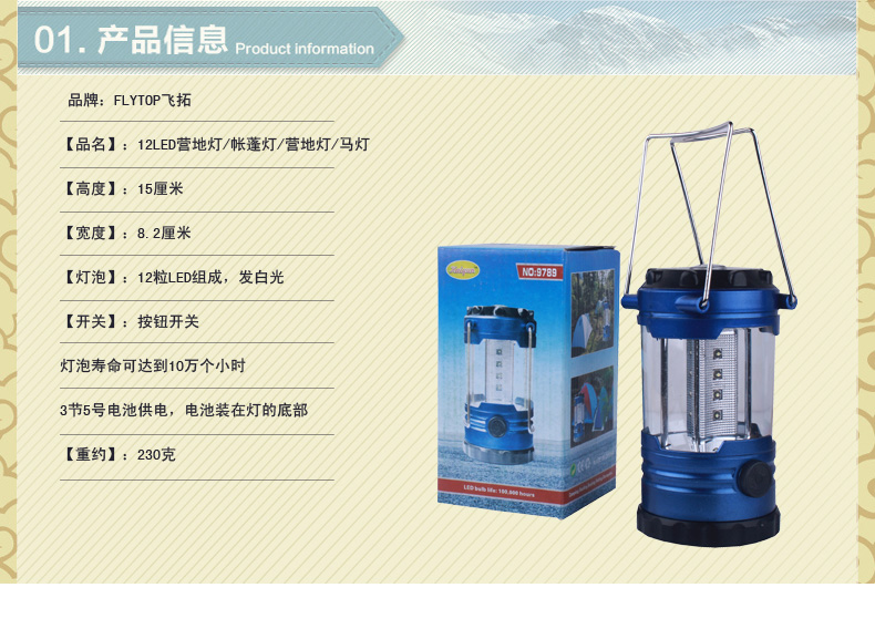 4、野營燈上下端都帶有反光鏡片,能使燈光照得更遠和更均勻5、3節5號電池供電,電池裝在燈的底部,打開電池盒蓋(本出售產品不含有電池)些,這種臺燈能照亮40平方米地面