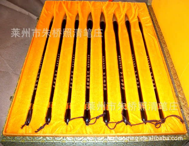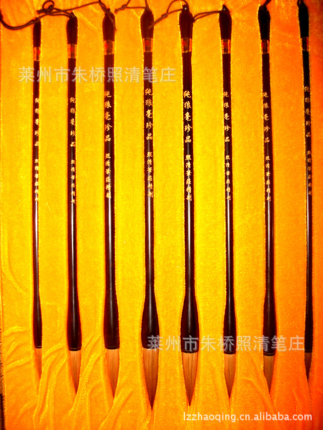 本廠主要生產:狼毫、羊毫、紫毫、兼毫、雞毫、灰鼠毫以及長峰、中峰、短峰、大楷、中楷、小楷,還有特制大提筆、鎮宅筆、高檔珍藏筆、禮品筆共有300多個品種900多個規格。主要用料筆頭以黑龍江省大興安嶺黃鼠狼尾毛、尾須、獾.針、兔影、貉.子毛、羊毛、羊須。筆桿用湖南湘妃、福建烤.紅等名竹以及虹木、紫譚、像牙、景太蘭等。
