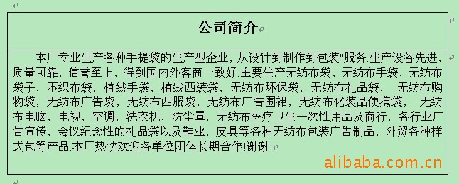 本廠專業(yè)生產(chǎn)各種手提袋的生產(chǎn)型企業(yè),從設(shè)計(jì)到制作到包裝'服務(wù).生產(chǎn)設(shè)備先進(jìn)、質(zhì)量可靠、信譽(yù)至上、得到國內(nèi)外客商一致好.主要生產(chǎn)無紡布袋,無紡布手袋,無紡布袋子,不織布袋,植絨手袋,植絨西裝袋,無紡布環(huán)保袋,無紡布禮品袋, 無紡布購物袋,無紡布廣告袋,無紡布西服袋,無紡布廣告圍裙,無紡布化裝品便攜袋, 無紡布電腦,電視,空調(diào),洗衣機(jī),防塵罩,無紡布醫(yī)療衛(wèi)生一次性用品及商行,各行業(yè)廣告宣傳,會議紀(jì)念性的禮品袋以及鞋業(yè),皮具等各種無紡布包裝廣告制品,外貿(mào)各種樣式包等產(chǎn)品.本廠熱忱歡迎各單位團(tuán)體長期合作!謝謝!